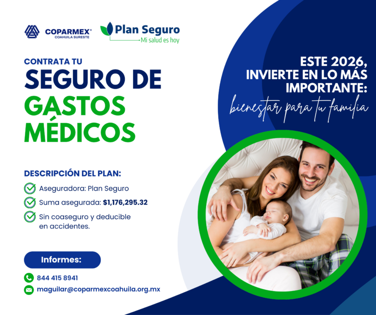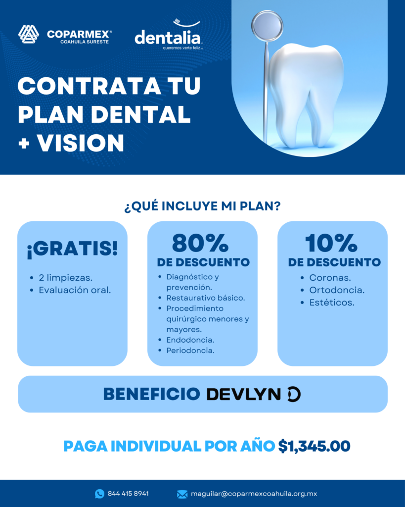 Servicios de Previsión SGMM coparmex-PLAN SEGURO MI SALUD ES HOY -Orientación médica -Revisiones dentales-Videollamadas con nutriólogos-Videollamadas con psicólogos-Y muchos más beneficios Plan dental dentalia-coparmex -Diagnóstico y Prevención-Restaurativo Básico-Procedimientos Quirúrgicos Menores y Mayores-Endodoncias-Periodoncia-Ortodoncia / Estética-Coronas / Prostodoncia Visita nuestras redes sociales Facebook Twitter Youtube Instagram Linkedin CONTACTO Lic. Marisol Aguilar maguilar@coparmexcoahuila.org.mx Tel: 844 415 8941Cel: 844 537 2566